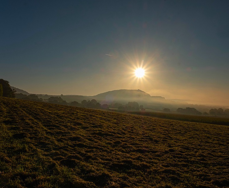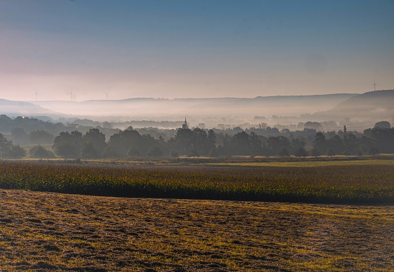 Nebelschwaden im Tal am frühen Morgen.